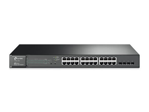 Адаптер TP-Link Smart гигабитный 24-портовый PoE+ коммутатор, 24 гигабитных порта RJ45, 4 SFP-слота, поддержка 802.3at/af, бюджет PoE до 215 Вт, статическая маршрутизация, VLAN на базе тега, STP/RSTP/MSTP, IGMP V1/V2/V3 Snooping, 802.1P QoS, ограничение скорости, Port Trunking, зеркалирование порта,