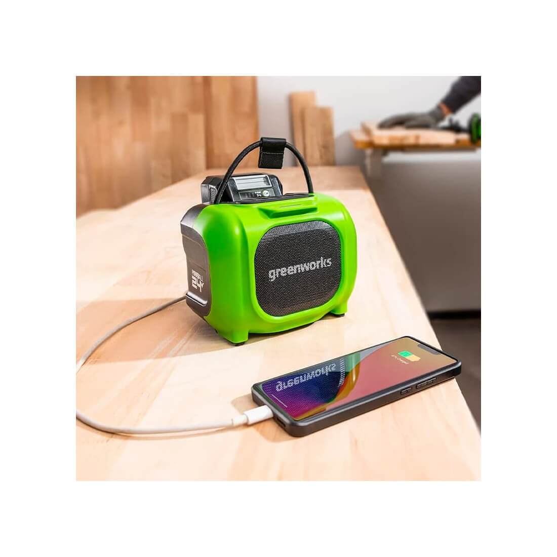 Одной из особенностей этой акустической системы является функция объединения двух устройств в стереопару (TWS). Для удобной переноски система оснащена рукояткой. Кроме того, беспроводная акустическая система Greenworks имеет порт USB-C для зарядки мобильных устройств и разъем AUX 3,5 мм для передачи звука по проводу.