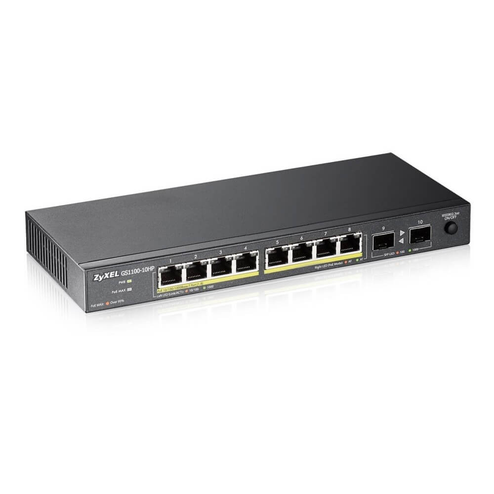 Неуправляемый коммутатор ZyXEL GS1100-10HP уровня Layer 1 со скоростью коммутации 20Гб/с, таблица MAC-адресов составляет 8K, содержит 8 портов 1 Гб/с RJ-45, оснащен 2 слотами SFP 1 Гб/с. Коммутатор поддерживает технологию PoE и имеет 8 портов RJ-45 с поддержкой PoE суммарной мощностью 120 Вт.