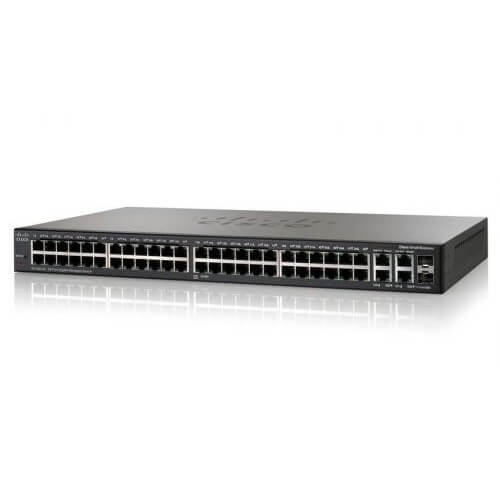 Управляемый коммутатор 3-го уровня Cisco SB SG300-52 (SRW2048-K9-EU). Интерфейсы: 50 x 10/100/1000 Мбит/с, объединенные порты 2 x 10/100/1000 и 2 x SFP. Матрица коммутации: до 104.0 Гбит/с, коммутация до 77.38 миллионов пакетов/с.