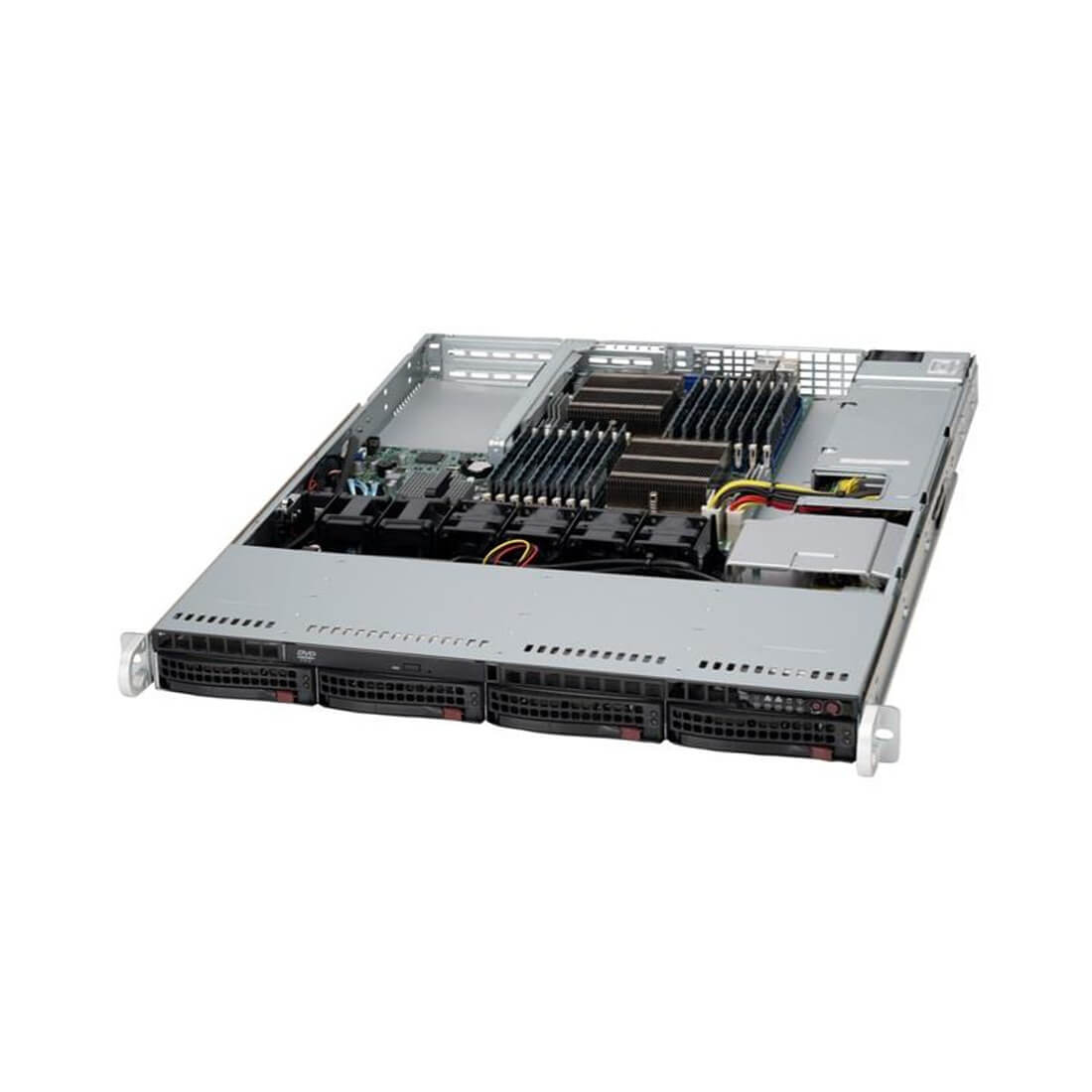 1U серверное шасси с одним блоком питания 500В. Максимально допустимый форм-фактор материнской платы - ATX. Максимальное количество установленых карт расширения - 1. 4 отсека под 2.5"/3.5" диски, стандартный SAS3 бекплейн.