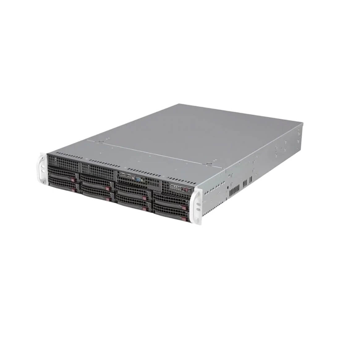 Шасси 2U, низкопрофильный брекет, 8-ми портовый бекплейн, 8 дисковых отсеков, поддержка всех итераций ATX материнских плат, избыточные блоки питания 800W.