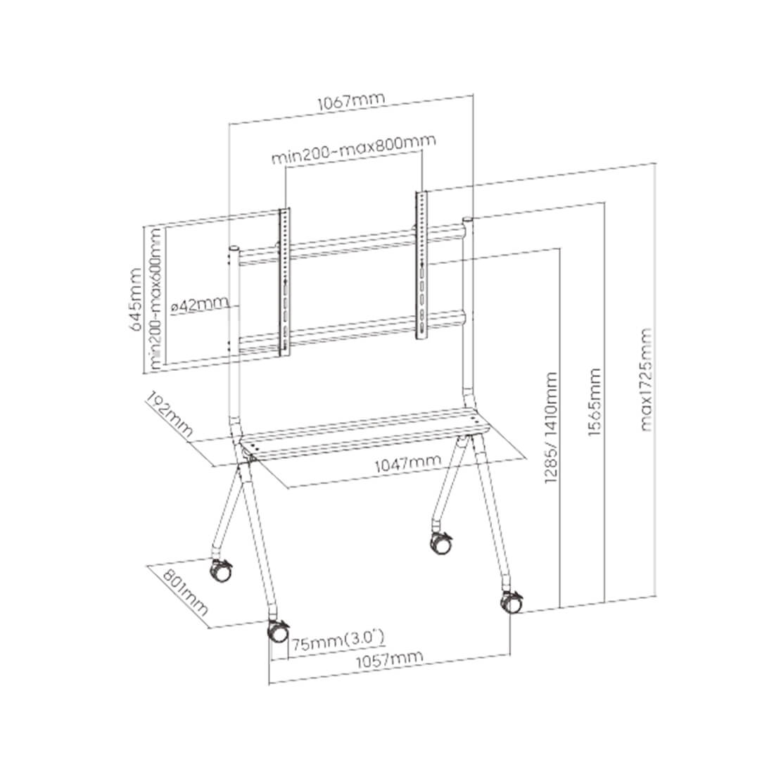 Экран может устанавливаться в двух положениях, регулируя высоту просмотра в соответствии с различными размерами телевизора и потребностями применения. Тележка для студийного телевизора перемещается вместе с человеком, чтобы сделать работу более эффективной. Четыре больших 75-миллиметровых колеса из прочных материалов поддерживают круговой поворот на 360° для обеспечения мобильности и гибкости.
