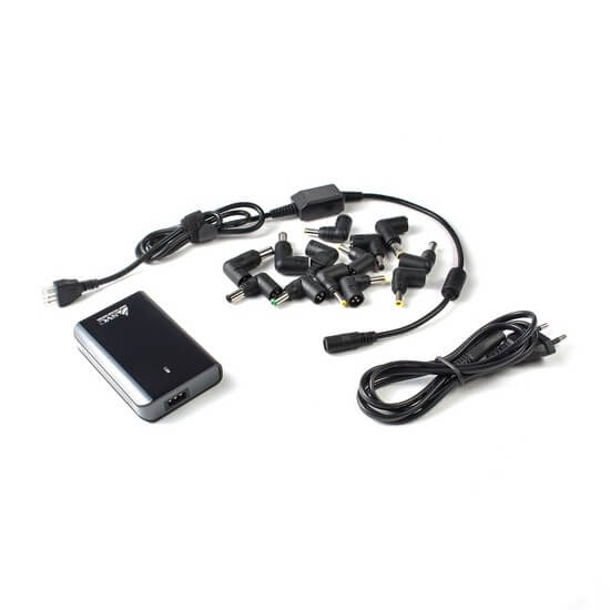 Универсальное зарядное устройство для ноутбуков с автоматической регулировкой напряжения и 13 сменными насадками, для зарядки ноутбуков, видео и фотокамер, мобильных устройств. Благодаря очень маленькому размеру - удобно при транспортировке.